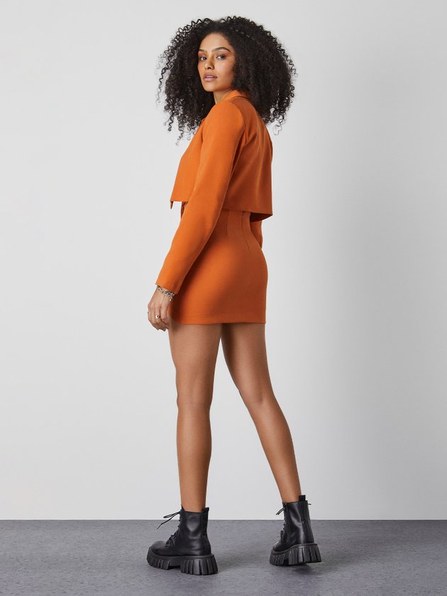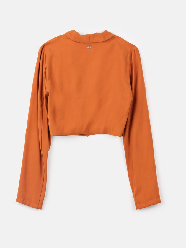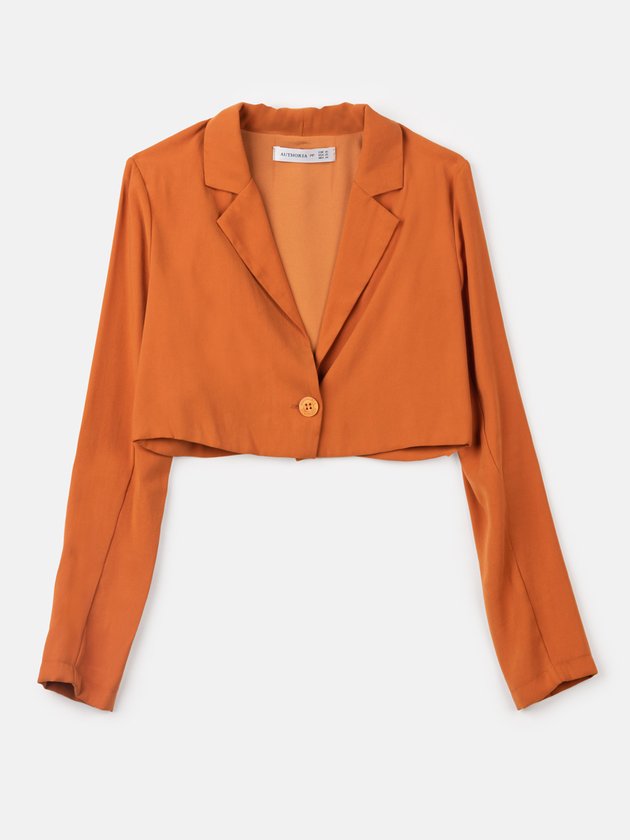 O blazer de alfaiataria feminino Authoria possui comprimento cropped, foi confeccionado em tecido crepe na cor laranja e conta com fechamento em botão a parte frontal. Deixa os looks charmosos e com ainda mais estiloso. Composição: 92% viscose e 8% poliéster. Forro: 100% poliéster. Ref.: T8858