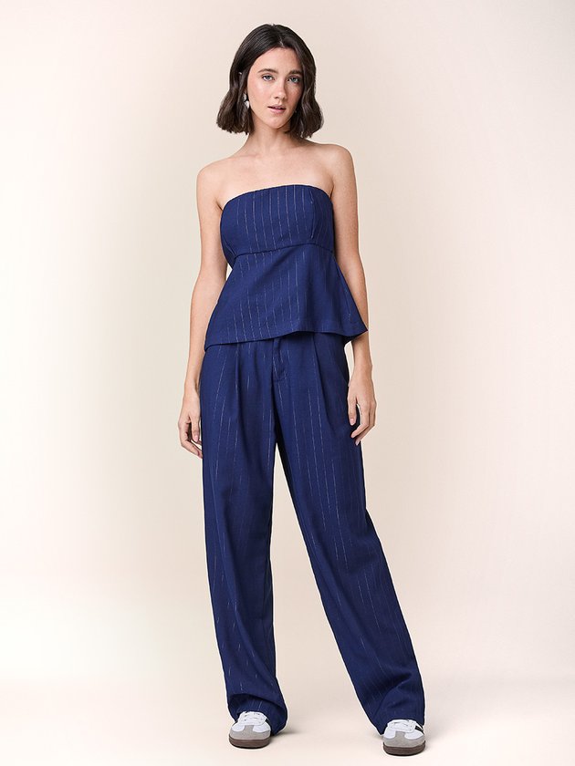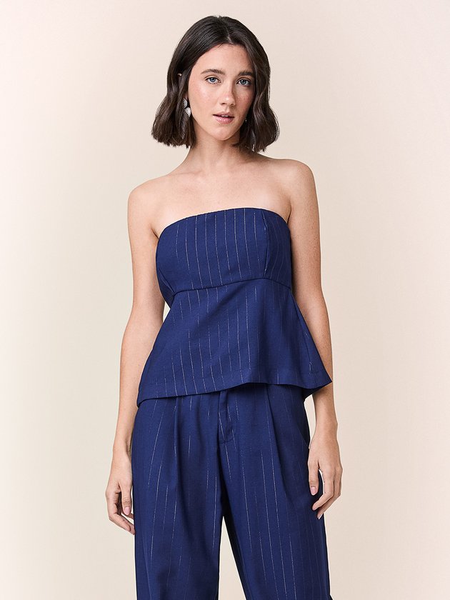Essa blusa azul com risca de giz traz sofisticação e estilo clássico. Perfeita para quem busca um visual alinhado e cheio de personalidade, é ideal para o dia a dia ou eventos corporativos.