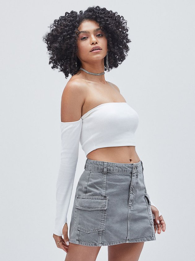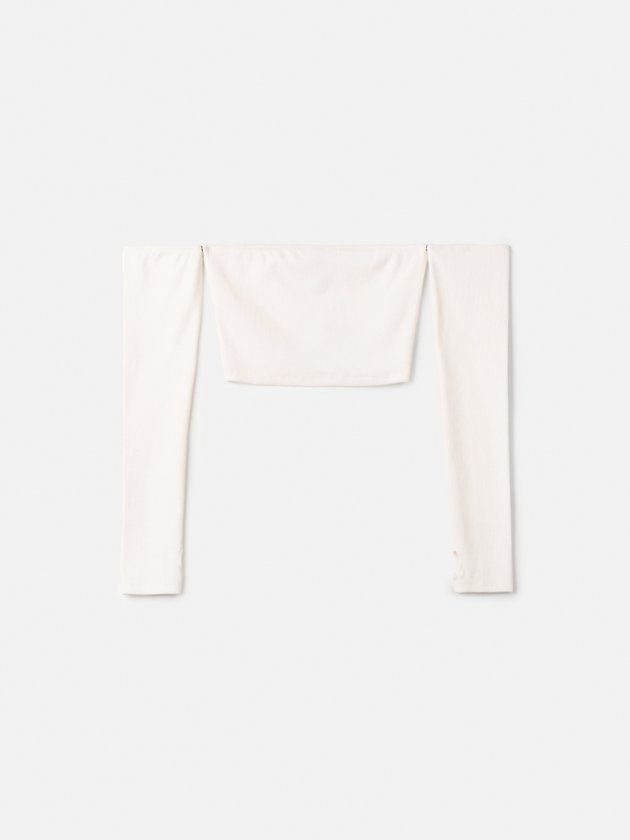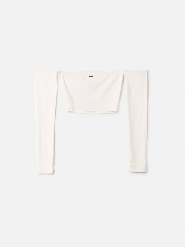 O cropped off white da Authoria em ribana, destaca-se pelas mangas removíveis, proporcionando versatilidade ao look. Seu design inovador inclui abertura para o dedo, conferindo um toque contemporâneo. Confeccionado com cuidado, é uma peça delicada, ideal para garotas que buscam estilo e conforto. Composição: 98% algodão e 2% elastano. Ref.: T9191