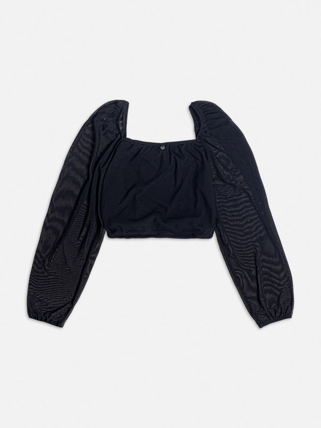 Esta blusa preta de tule com franzidos é perfeita para um visual romântico e delicado. O tule traz leveza e um toque de sofisticação, sendo ideal para composições mais elegantes.