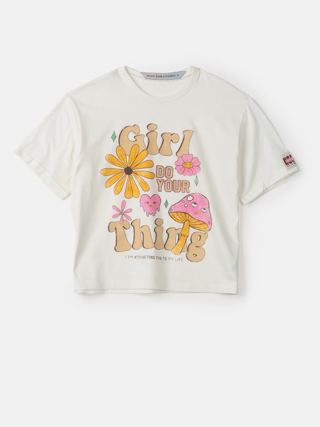 A t-shirt I Am foi confeccionada em meia malha na cor pérola, conta com estampa divertida de cogumelos e flores. Além de trazer um design delicado que faz diversos looks fofos ela também possui etiqueta decorativa na manga. Composição: 100% algodão. Ref.: R3677