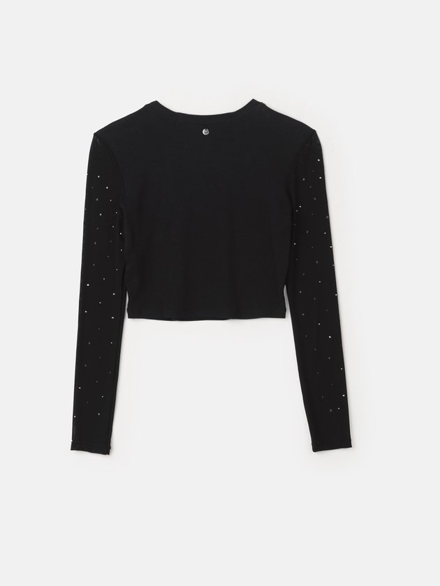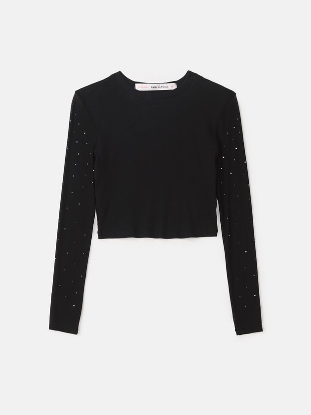 O cropped preta I Am é confeccionado em malha canelada com mangas de tule, decoradas com strass aplicado. O modelo justo ao corpo e o design fashion conferem um estilo moderno, perfeito para compor um look elegante. Composição: 98% algodão e 2% elastano. Mangas: 96% poliamida e 4% elastano. Ref.: R3610