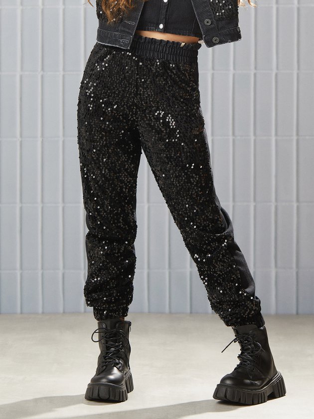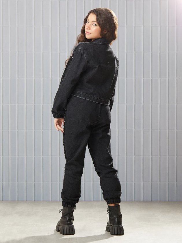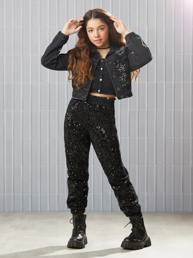 A Calça Juvenil Black I Am é confeccionada em sarja com frente em paetê, proporcionando um brilho único e elegante. Com elástico na cintura e barra, a peça é estilosa e garante conforto durante o uso. Ideal para garotas que buscam um look exclusivo. Composição - 100% algodão. Frente: 97% poliéster e 3% elastano. Ref.: R3665