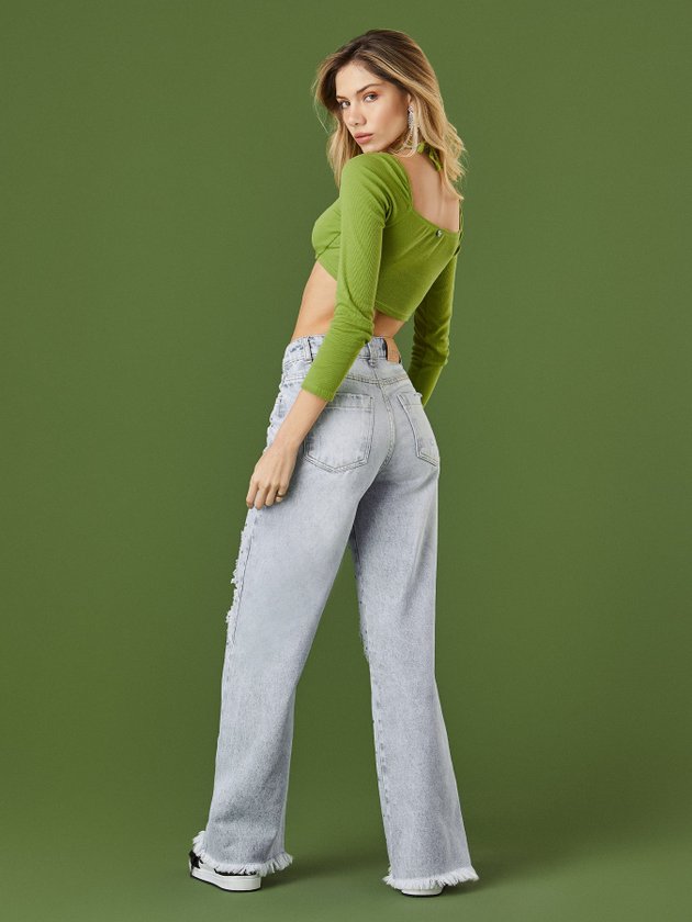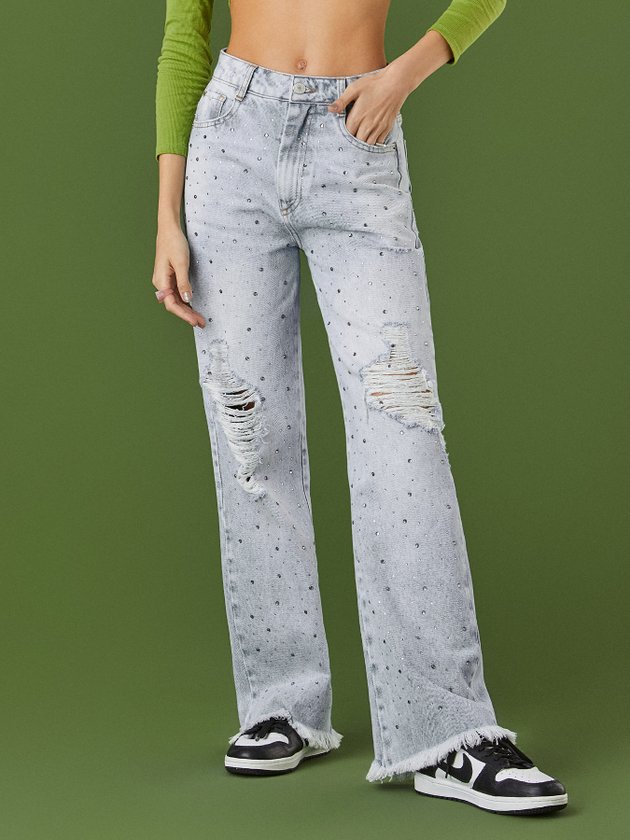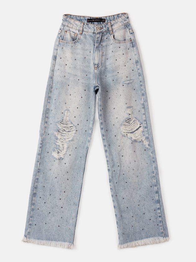 Com design fashionista a calça wide leg Authoria foi confeccionada em jeans com destaque para a aplicação de strass na peça. Traz no cós etiqueta decorativa atrás, passante para cinto, abertura com botão e zíper de metal. Finalizada com bolsos funcionais e rebites. Composição: 100% algodão. Ref.: T8587