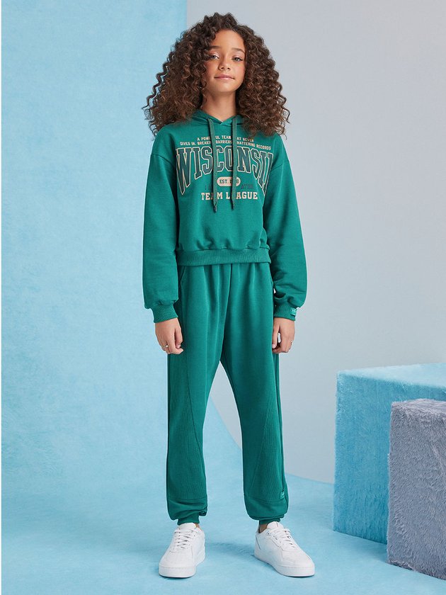 A calça verde Iam é confeccionada no conforto do moletom. Nos detalhes possui ribana no punho, etiqueta decorativa na cintura com elástico, cadarço e recorte nas pernas. Essa peça traz um conforto especial para as garotas além de ser super prática para o dia a dia. Composição: 100% Algodão. Ref.: R4189