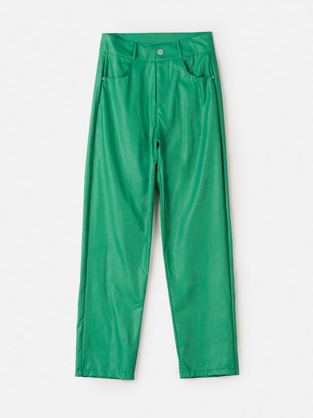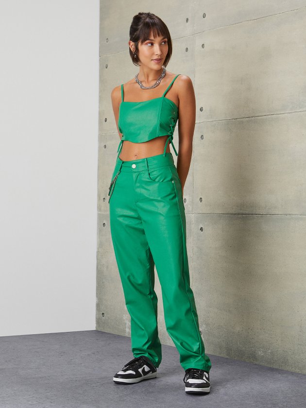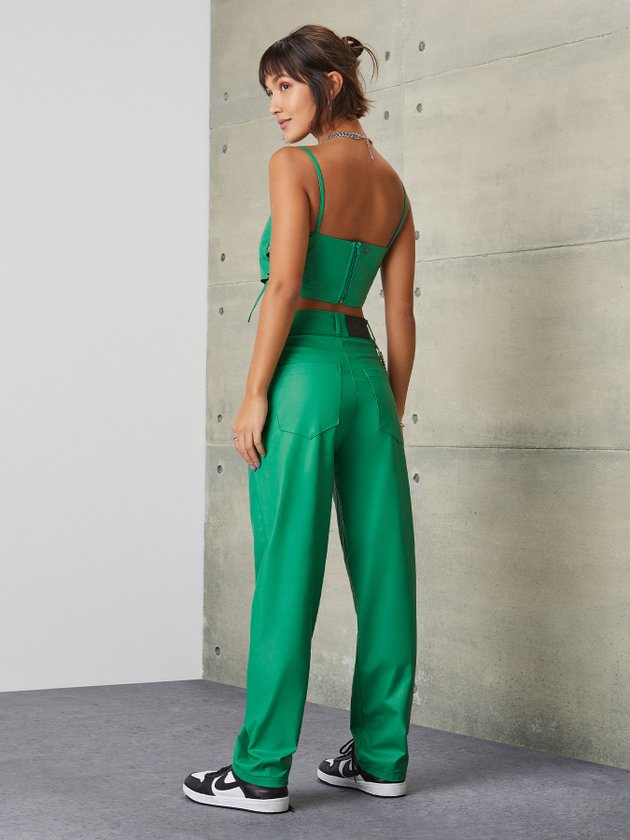 A Calça Verde Authoria é uma peça moderna e estilosa, feita com fake leather de alta qualidade. Possui cós com passante para cinto, bolsos funcionais e etiqueta decorativa, conferindo um visual elegante e sofisticado. Ideal para compor looks autênticos. Composição: 87% viscose e 13% poliuretano. Revestido: 100% poliuretano. Ref.: T8794