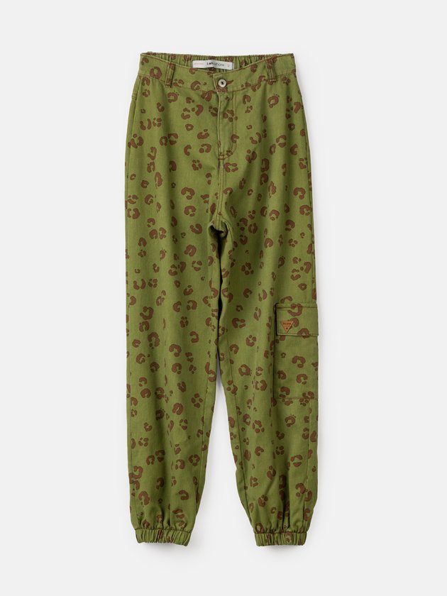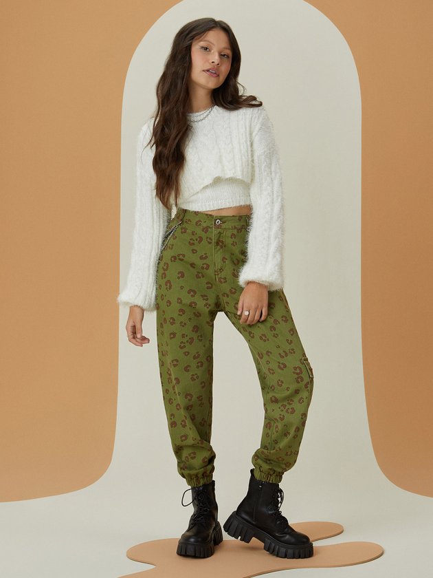 A calça I Am foi desenvolvida em sarja na cor verde com estampa animal print, traz bolso funcional, detalhes de rebites de metal, cós com elástico atrás e abertura com botão personalizado. A peça carrega um visual fashion que compõe looks com muito estilo para as garotas. Composição: 100% algodão. Ref.: R3426