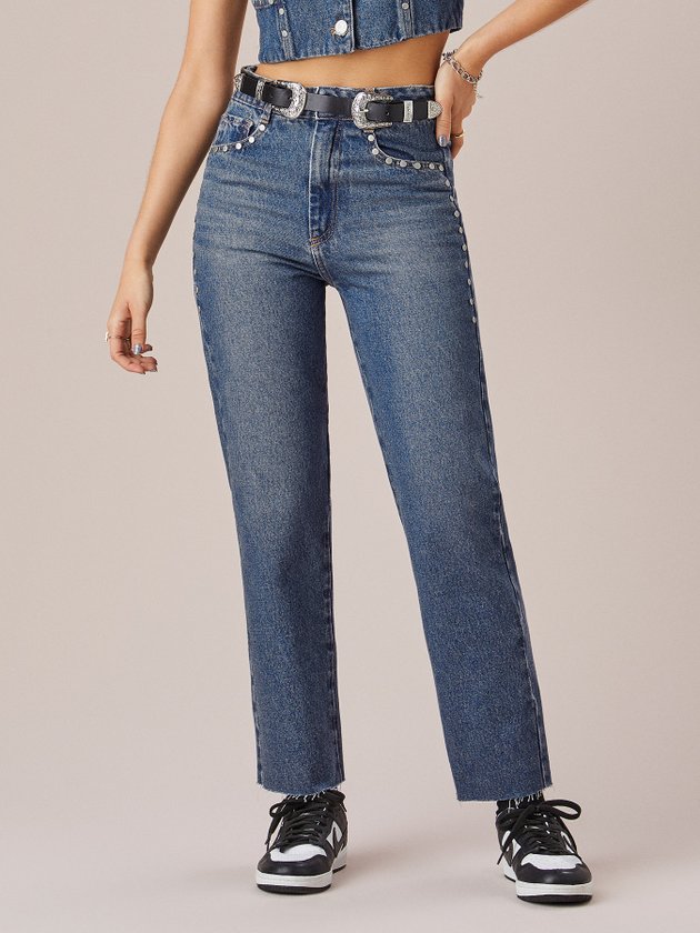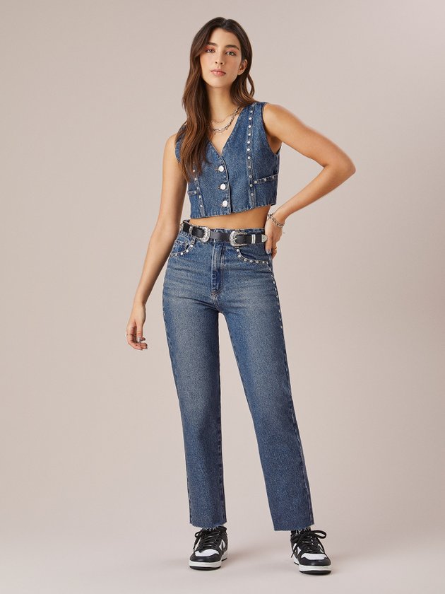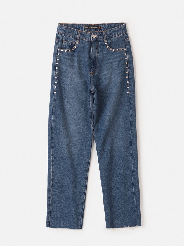 A calça jeans da marca Authoria é uma peça fashion e estilosa, com detalhes que a tornam única. A parte da frente é decorada com tachinhas aplicadas, que dão um toque de personalidade. O cós possui passantes para cinto, e uma etiqueta decorativa completa o visual. Composição: 100% algodão. Ref.: T8646