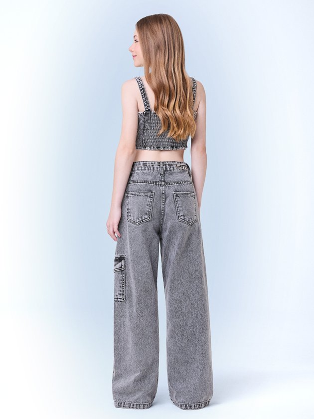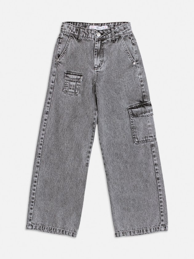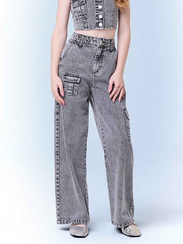 Moderna e funcional, esta calça cargo jeans na cor cinza apresenta bolsos utilitários que unem estilo e praticidade. Perfeita para compor looks descolados e urbanos.