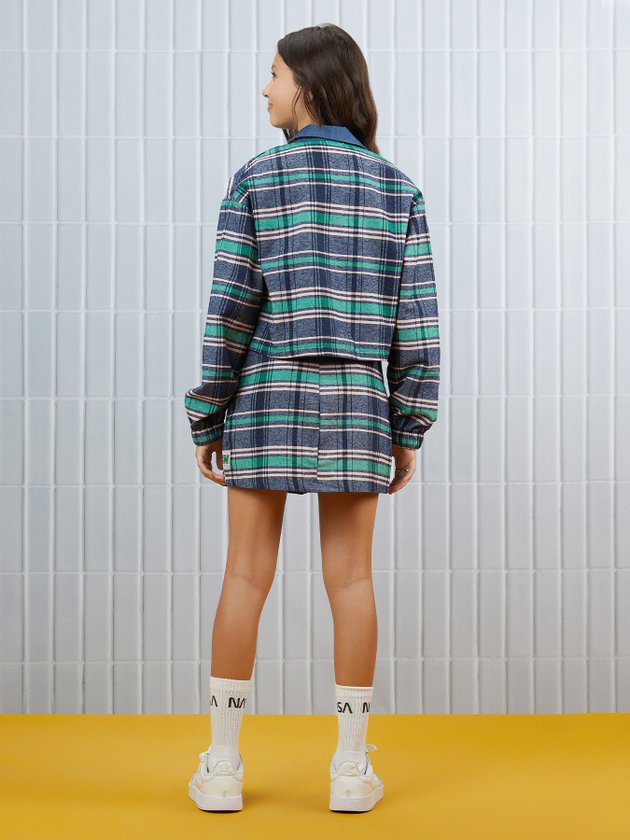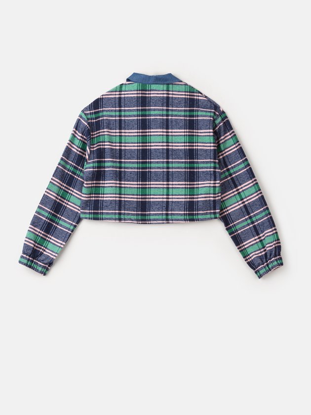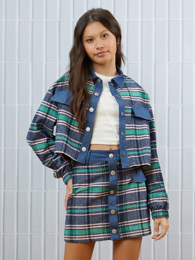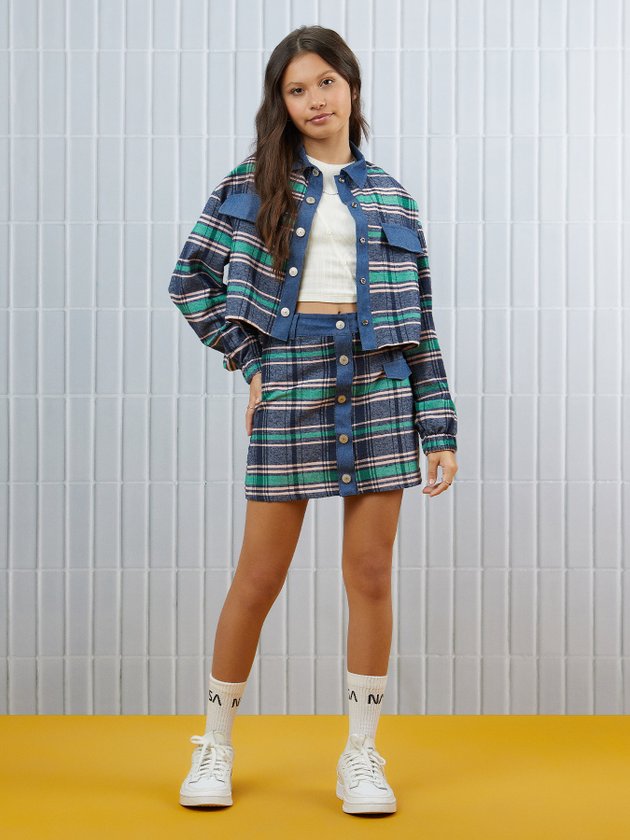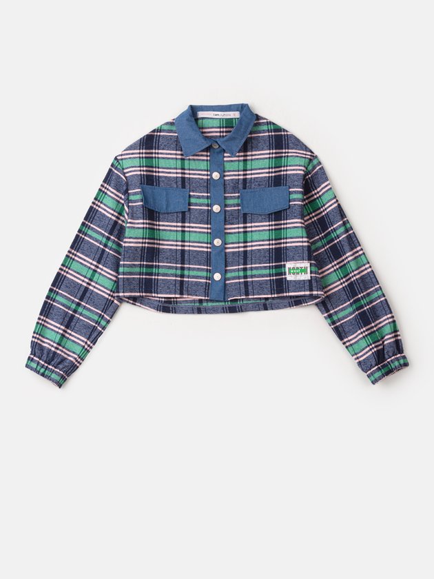 A camisa de flanela I Am é uma peça charmosa e quentinha, com estampa xadrez e detalhes em jeans. Possui abertura frontal com botões de metal personalizado, modelagem cropped e punho com elástico. É uma opção elegante e confortável para os dias frios. Composição: 61% algodão e 39% poliéster. Ref.: R3629