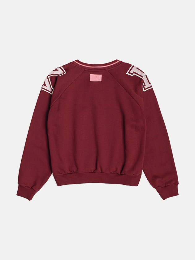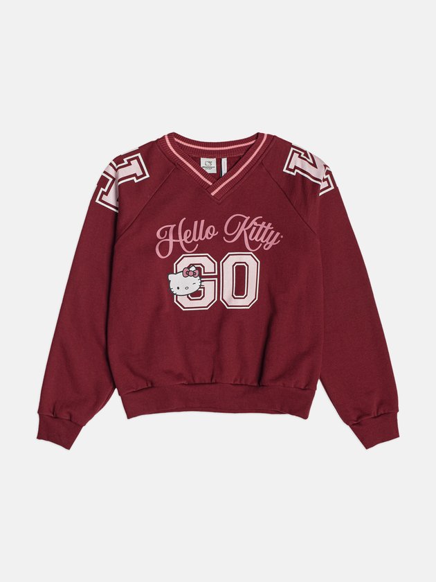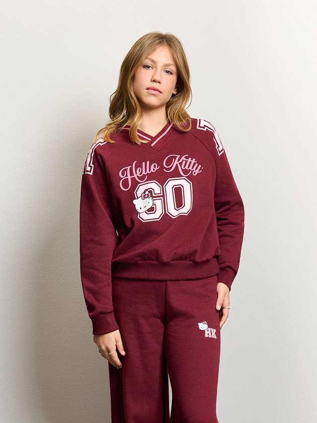 O moletom bordô da Hello Kitty chega com forte influência collegiate, tendência que voltou com tudo e tem tudo a ver com a proposta da Authoria para a temporada. O decote V canelado bicolor cria um visual esportivo-chic, enquanto os números aplicados nos ombros reforçam a estética de uniforme moderno. A estampa frontal traz o lettering Hello Kitty 60 com a personagem aparecendo de forma charmosa, criando um mix perfeito entre nostalgia e estilo atual. A modelagem é confortável, com punhos e barra canelados que dão estrutura e mantêm o shape elegante. Essa peça conversa com jeans, saias e até sobreposições com camisas para quem ama um toque fashion extra. A dica é combinar com acessórios em tons claros ou metalizados para iluminar o look e reforçar a vibe jovem e estilosa da coleção Backstage. Ref.: R5455