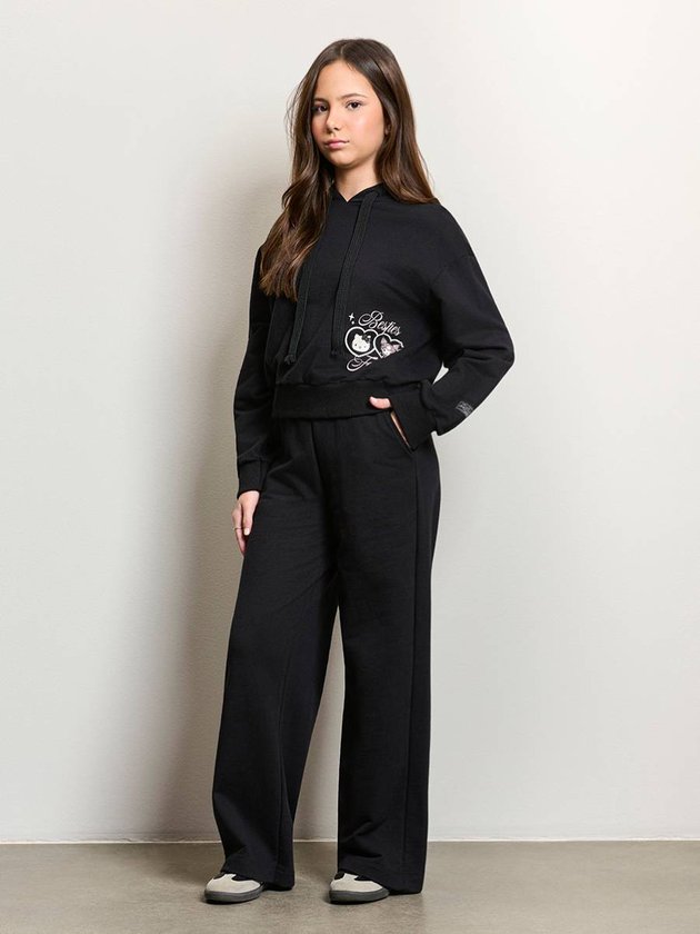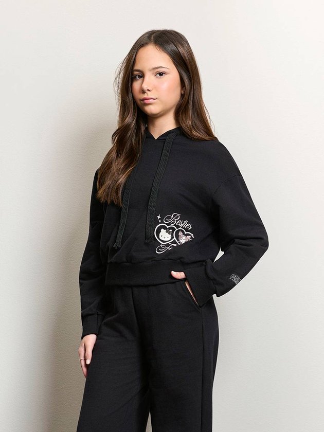 Esse moletom preto cropped Besties Forever entrega uma estética descolada com toque fofo através da dupla icônica Hello Kitty e Kuromi, estampadas em corações outline que adicionam leve brilho e contraste. O capuz com cordões largos traz uma pegada urbana, enquanto a barra e os punhos canelados garantem caimento estruturado e confortável. A modelagem curta deixa o look mais moderno e conversa com a silhueta da coleção Backstage, que aposta em peças que unem feminilidade e força. É perfeito para compor produções casuais, seja com jeans de cintura alta, saia midi ou sobreposto a camisas para criar camadas interessantes. Como dica de estilo, combine com acessórios metalizados ou botas tratoradas para trazer aquele toque fashion-forward que eleva o visual sem esforço. Ref.: R5456