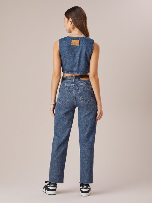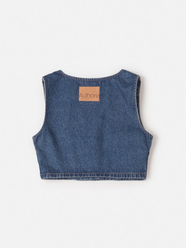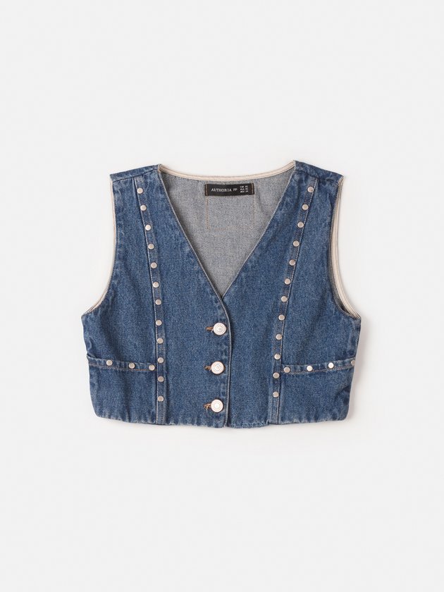 Este colete jeans Authoria é uma peça fashion com aplicação de tachas. Abertura frontal com botão personalizado, este colete é perfeito para completar o seu look. A etiqueta decorativa nas costas adiciona um toque especial a esta peça. Composição: 100% algodão. Ref.: T8787