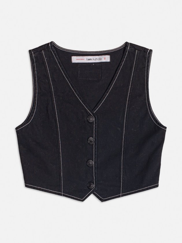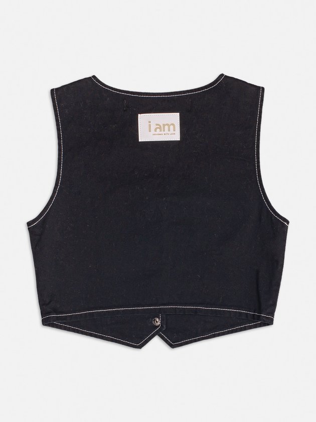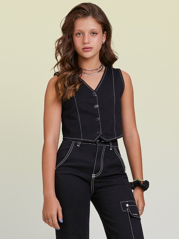 Colete preto I Am em sarja, com abertura de botão de pressão e etiqueta decorativa nas costas. Peça em alta na tendência da moda, ideal para garotas que buscam estilo e versatilidade em um só item. Complemente seu visual com esse colete moderno. Composição: 98% algodão e 2% elastano. Ref.: R3930