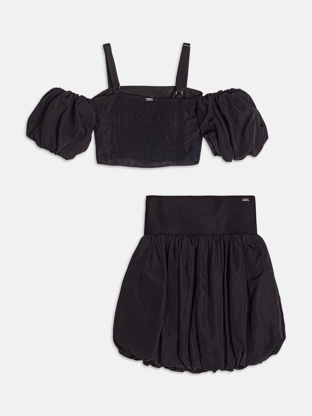 Um look que respira originalidade e frescor. O conjunto une a sofisticação da alfaiataria com o toque fashionista das mangas e barra balonê, tendência confirmada da estação. Ideal para produções monocromáticas que exalam personalidade.
