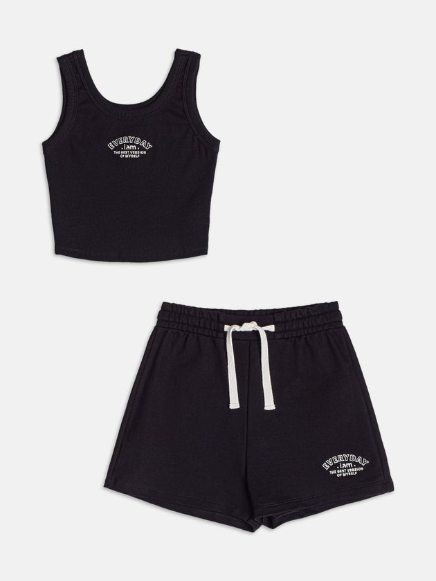 Conforto e estilo se encontram neste conjunto de ribana preta com detalhe em cadarço. A textura ajustada valoriza o corpo sem abrir mão da leveza, enquanto o cadarço adiciona um toque esportivo e moderno. Perfeito para compor looks versáteis do urbano ao casual chic.