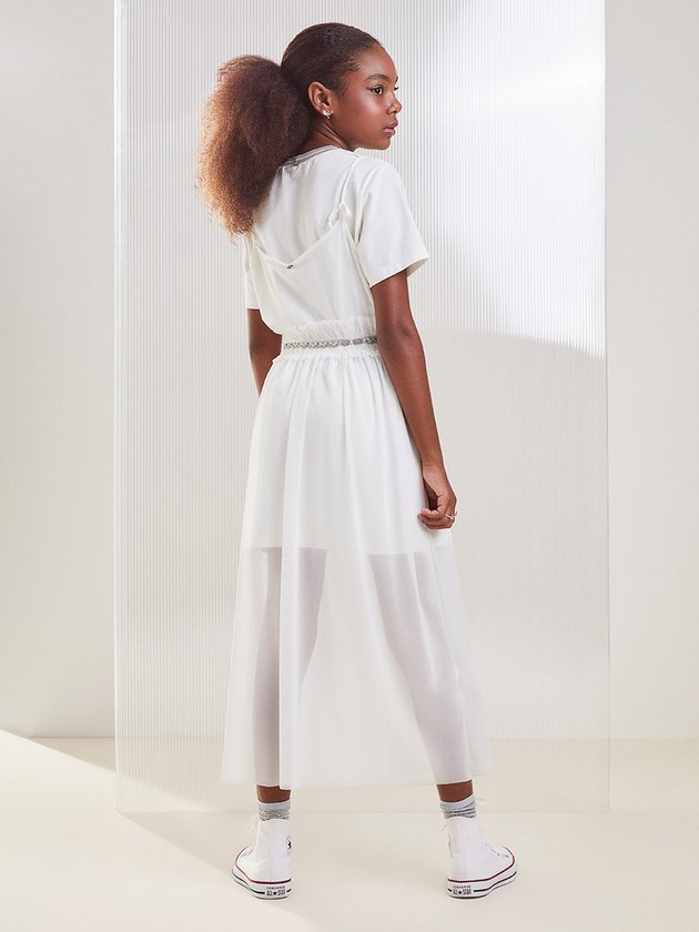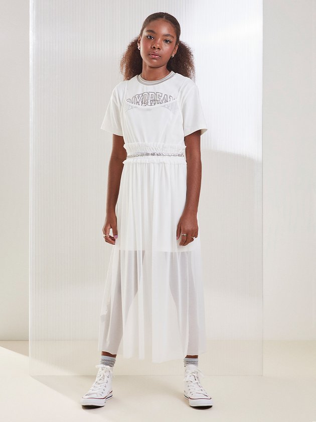 Um conjunto que combina conforto e estilo em perfeita harmonia! Composto por uma camiseta branca de malha com estampa "Daydream" e um vestido de tule transparente sobreposto, esta peça traz um toque moderno e descolado. O detalhe do elástico com brilho na cintura adiciona sofisticação ao visual, enquanto o caimento fluido do tule garante leveza e movimento. Ideal para ocasiões casuais ou produções mais elaboradas, é versátil e cheio de personalidade.
