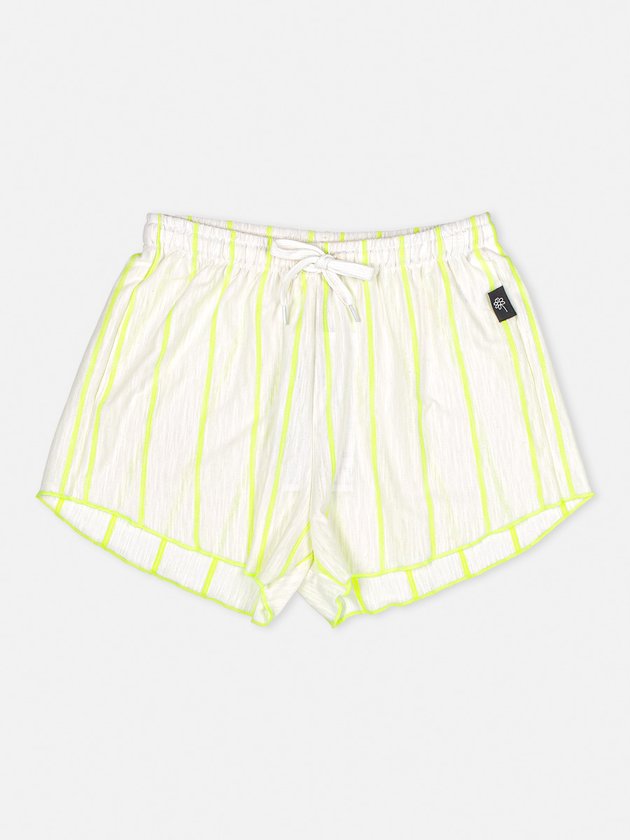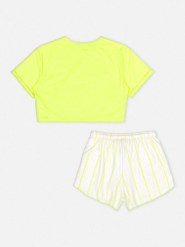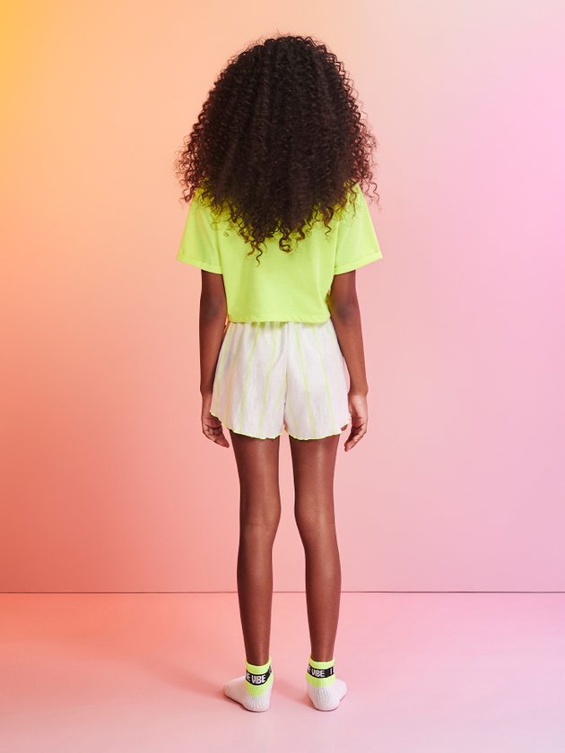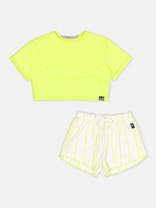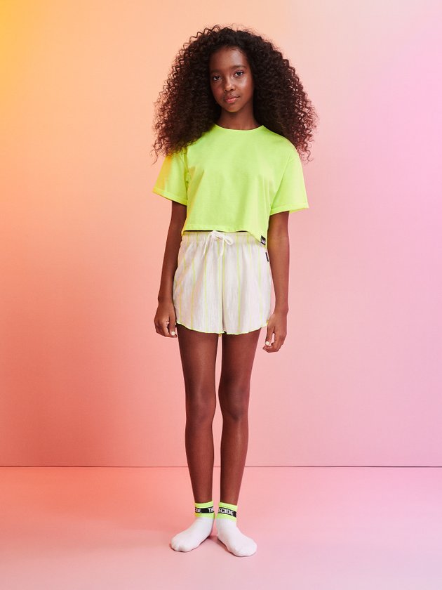 O conjunto de pijama I’am é composto por blusa em malha neon com modelagem mais curta, uma peça pra lá de confortável ideal para acompanhar as garotas nas noites de sono, na parte de baixo conta com short listrado, no cós traz elástico interno e cadarço para ajuste, impossível não se apaixonar por esse conjunto. Composição - Blusa: 97% poliéster e 3% elastano - Short: 54% algodão e 46% poliéster. Ref.: R3334