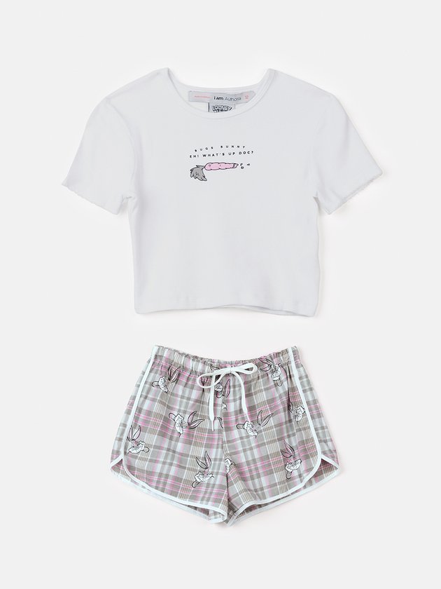 O conjunto de pijama I Am apresenta uma estampa divertida do Looney Tunes em uma blusa de malha canelada e short feito em tecido xadrez. Com cintura elástica, é confortável e fofo, proporcionando um sono agradável. Composição - Blusa: 98% algodão e 2% elastano. Short: 100% algodão. Ref.: R3772