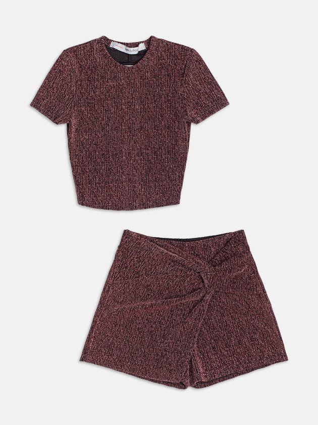 Com visual iluminado e vibe fun, o conjunto rosa ganha ainda mais destaque com os toques metalizados em foil. A combinação de conforto com brilho cria uma estética fashion fresh e moderna. Use com tênis ou papetes para um styling cheio de estilo.