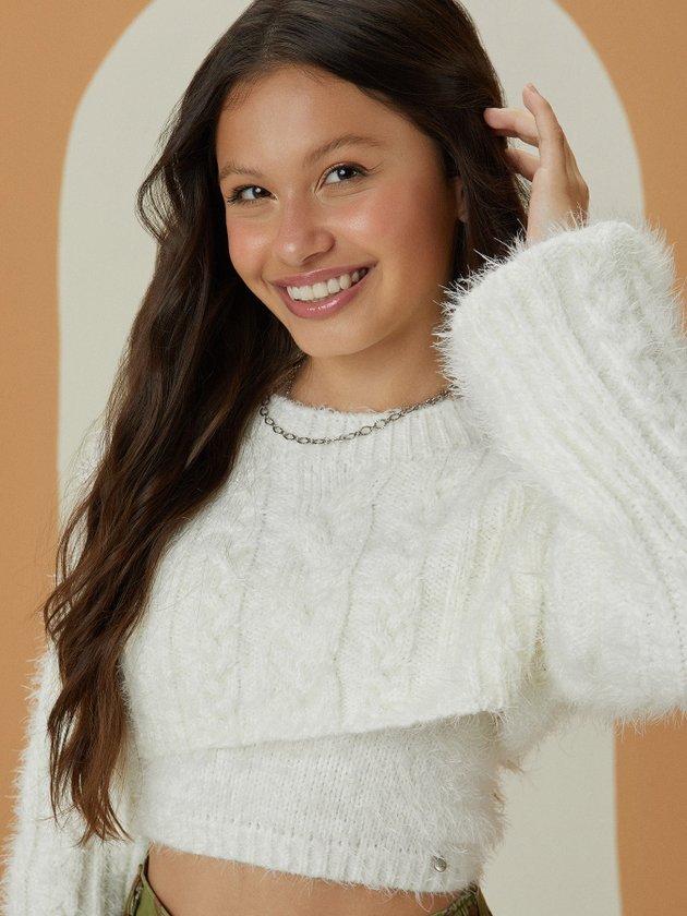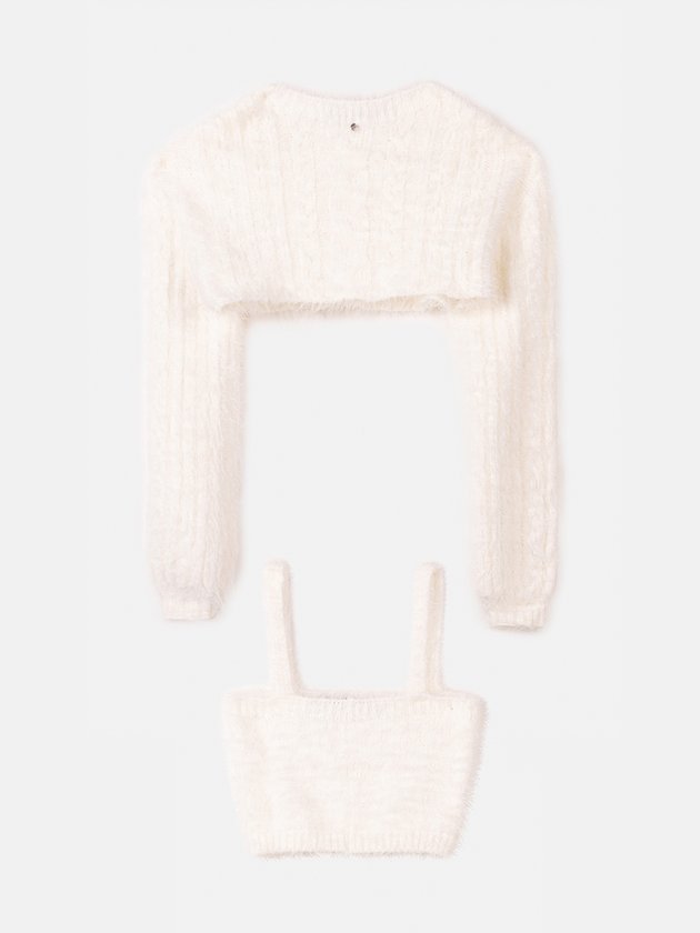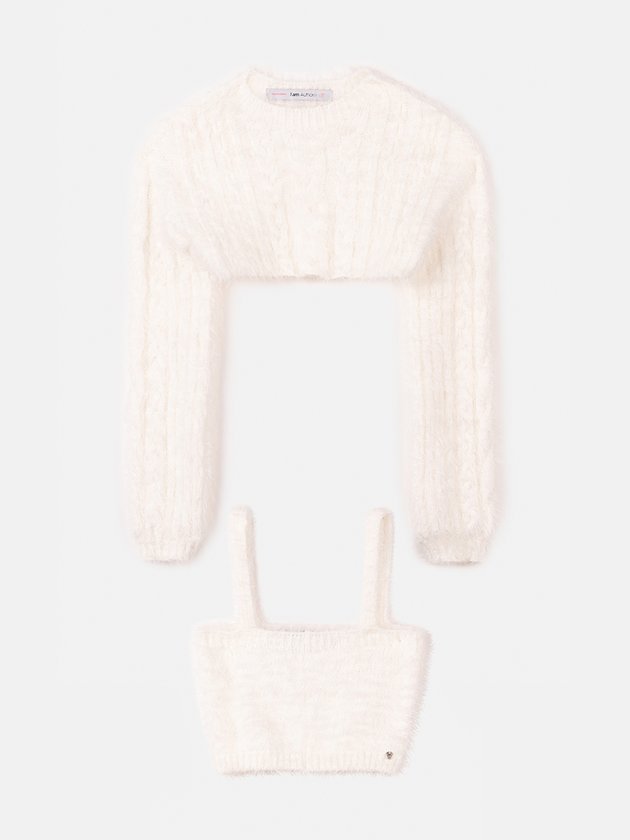 Desenvolvido em tricot off white o conjunto I Am traz conforto para o corpo das garotas, em seus detalhes conta com plaquinha de metal personalizada da marca e elástico no punho. Peças ótimas para os dias mais frios, porque além de confortáveis vão esquentar ainda mais o dia a dia delas. Composição: 65% acrílico e 35% poliamida. Ref.: R3848
