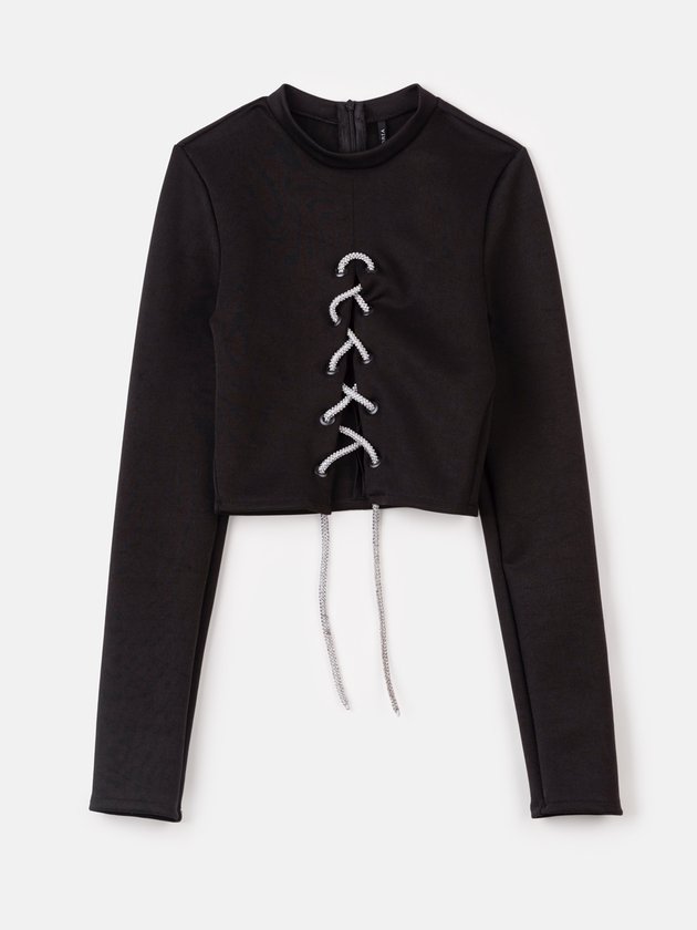 Cropped com design cool que traz cadarço frontal em pedraria enriquecendo ainda mais o visual das fashionistas. Confeccionado em malha com modelagem ajustada ao corpo, pode ser usado com short de cintura alta ou calça wide leg, aposte nos acessórios e arrase no look! Composição: 96% poliéster e 4% elastano. Ref.: T8804