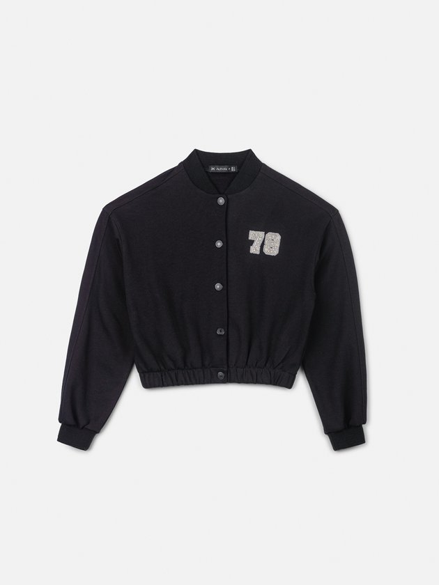 Casual e cheia de estilo, esta jaqueta bomber preta traz um toque retrô com o aplique '78' em strass. Com fechamento de botões e acabamento canelado, ela é ideal para looks despojados que não abrem mão de personalidade. Combine com jeans ou saia para um visual moderno.