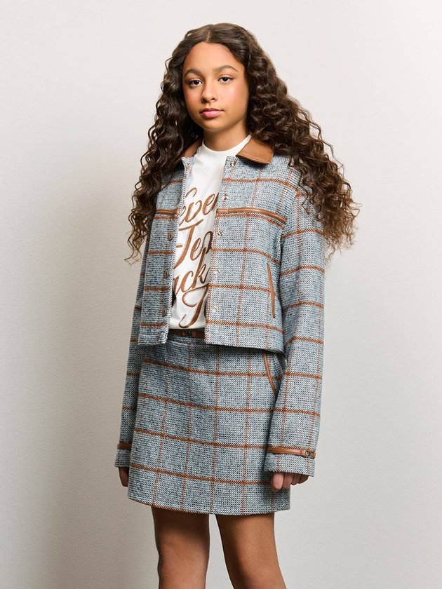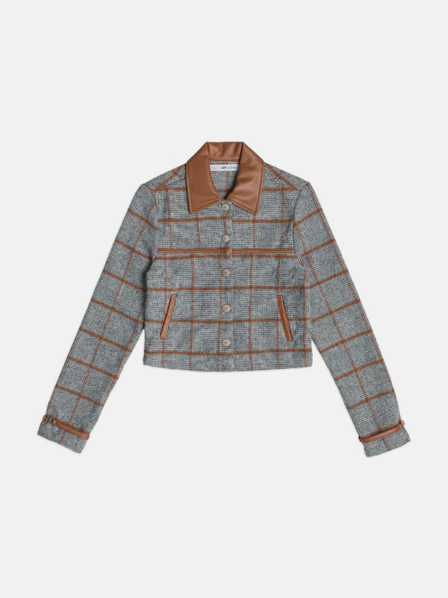 Jaqueta cropped em tecido encorpado com padrão xadrez em cinza e linhas caramelo. Os recortes em fake leather no bolso, gola e punhos elevam o visual, criando contraste moderno e sofisticado. O fechamento frontal é feito por botões metálicos, e a peça possui dois bolsos funcionais. Modelagem estruturada que veste super bem e traz aquele mood preppy fashion. Ref.: R5583