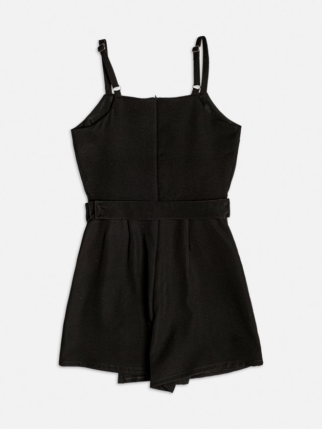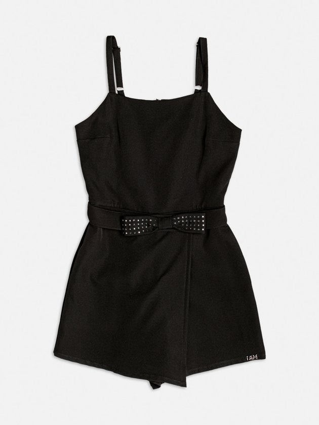 Minimalista e sofisticado, o macaquinho preto ganha destaque com o cinto de laço bordado em mini studs. Com alças largas, shape levemente acinturado e barra assimétrica, é ideal para produções que equilibram estilo e elegância.