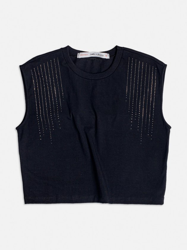 Moderna e cheia de atitude, esta muscle tee preta com strass é perfeita para composições urbanas. Os detalhes em strass adicionam um toque de brilho, ideal para looks despojados e estilosos.
