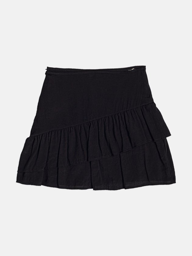 Aqui, a assimetria é o grande destaque: a saia preta apresenta duas camadas de babados com direções diferentes, criando um efeito visual dinâmico e moderno. A amarração lateral traz delicadeza e permite ajustar a peça com precisão no corpo. O tecido leve proporciona fluidez, fazendo com que os babados acompanhem o movimento de forma natural e elegante. O acabamento das barras é bem clean, deixando a peça com aparência sofisticada e versátil. É aquela saia que conversa com diversas propostas do casual ao mais arrumado mantendo sempre um ar fashion e leve. Ref.: R5540