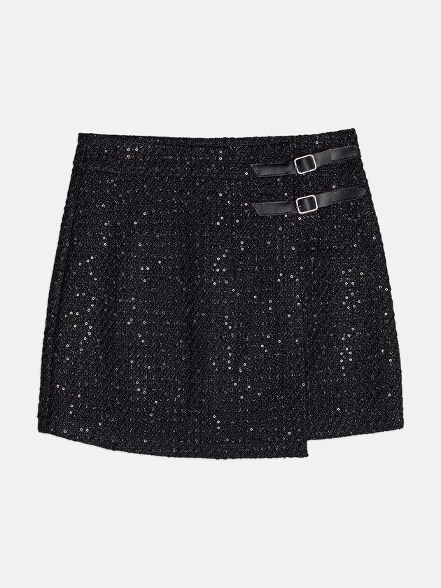 A saia aposta num tweed moderno com fios brilhantes, criando um efeito glam discreto e elegante. A construção transpassada na frente adiciona estilo e movimento, enquanto as duas fivelas laterais trazem um toque fashion que deixa a peça ainda mais atual. O caimento estruturado mantém a forma bonita no corpo e garante um visual sofisticado. Funciona perfeitamente com croppeds, camisas e peças de alfaiataria, entregando uma produção marcante sem esforço. Ref.: R5510