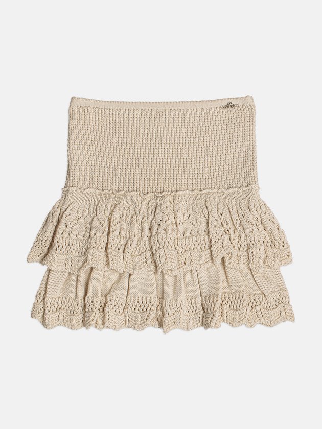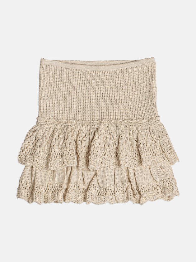 A saia de tricot aparece em sua versão mais romântica: modelagem no estilo evasê, cintura superconfortável e camadas rendadas que criam movimento, textura e profundidade visual. A construção é toda trabalhada, alternando pontos, tranças e desenhos vazados que remetem ao handmade chic. A paleta off deixa tudo mais elegante e fácil de combinar, seja com tops básicos, peças de alfaiataria ou looks monocromáticos. Uma peça charmosa, delicada e com vibe artesanal moderna. Ref.: R5719