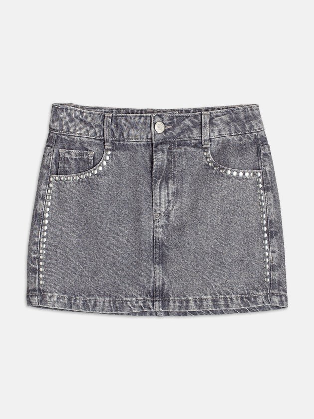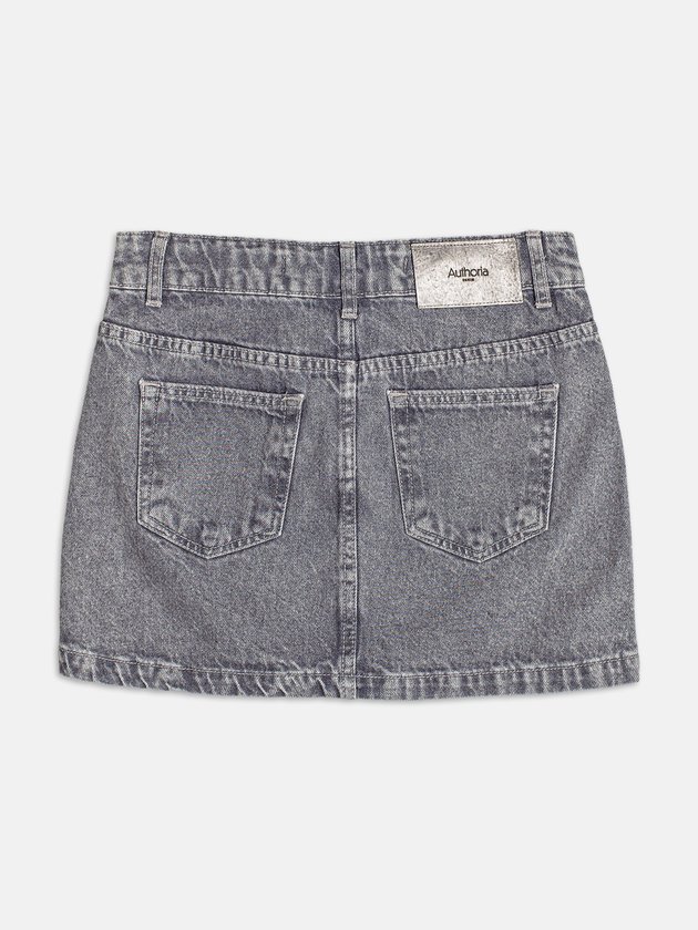 A atemporalidade do jeans se reinventa com brilho aplicado, criando uma peça que transita entre o casual e o glam. A saia tem caimento reto e detalhes que captam a luz com sutileza, ideal para composições noturnas ou para iluminar o look do dia. Combine com t-shirt básica ou camisa oversized para um contraste de estilos.