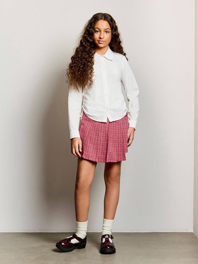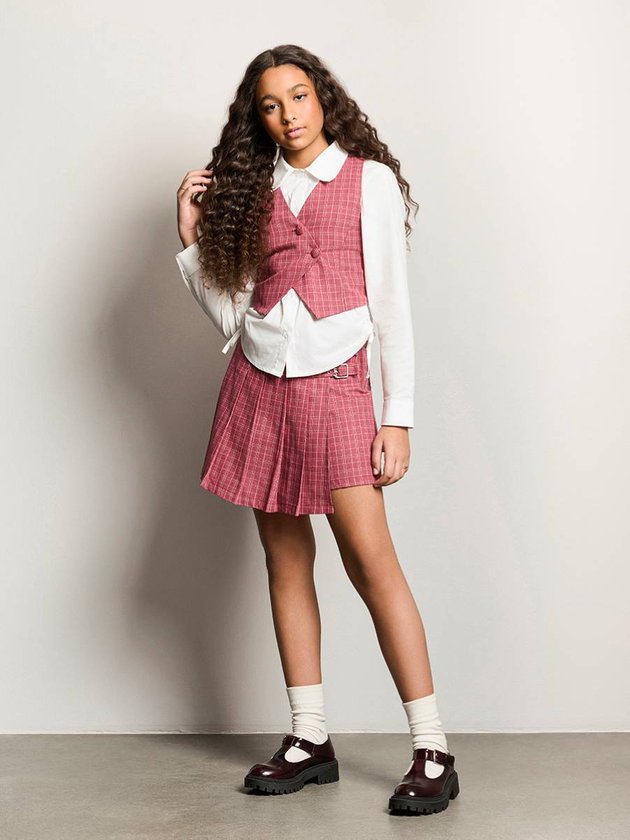 A saia traz xadrez vermelho tradicional reinterpretado com um toque moderno. A modelagem plissada cria volume leve e movimento a cada passo, enquanto as duas fivelas laterais adicionam um detalhe estiloso que remete ao mood colegial sofisticado. O tecido estruturado garante ótimo caimento e mantém o shape impecável. Prática e versátil, combina com blusas básicas, tricôs ajustados e jaquetas, compondo produções jovens, elegantes e cheias de personalidade. Ref.: R5513