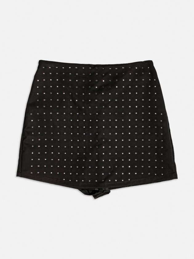 A saia preta ganha protagonismo com aplicação de strass em padronagem geométrica. O modelo tipo short-saia traz segurança e estilo para as It Girls.