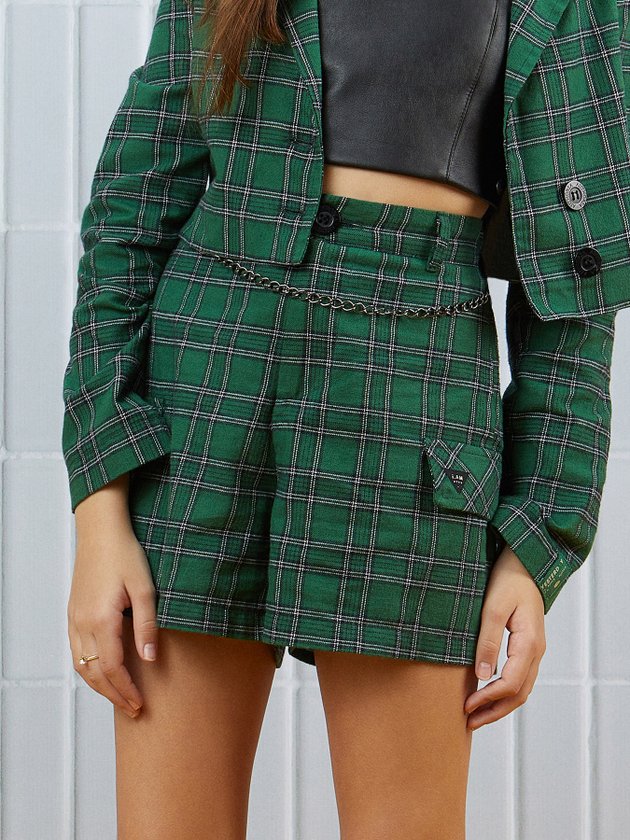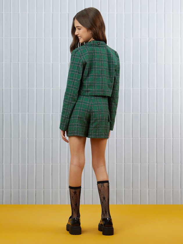 O short verde I Am é uma peça de moda elegante e moderna. Feito em tecido xadrez, possui modelagem de alfaiataria que proporciona um caimento impecável no corpo. O cós das costas conta com elástico e passante para cinto, garantindo conforto e praticidade. Composição: 100% algodão. Ref.: R3598