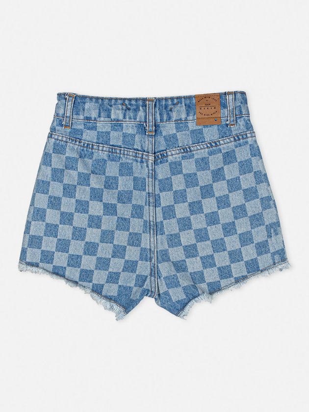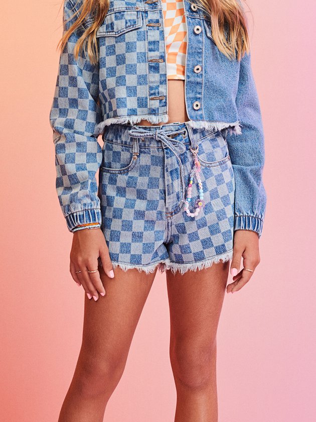 O Short Jeans I’am com lavação clara e efeito quadriculado, na cintura possui cós com caseado e friso para ajuste e dar laço, abertura frente com botão e zíper. Conta com etiqueta decorativa na parte de trás e barra desfiada. Uma peça que vai com tudo e é ideal para composições em dias mais quentes. Composição: 100% Algodão. Ref.: R3106