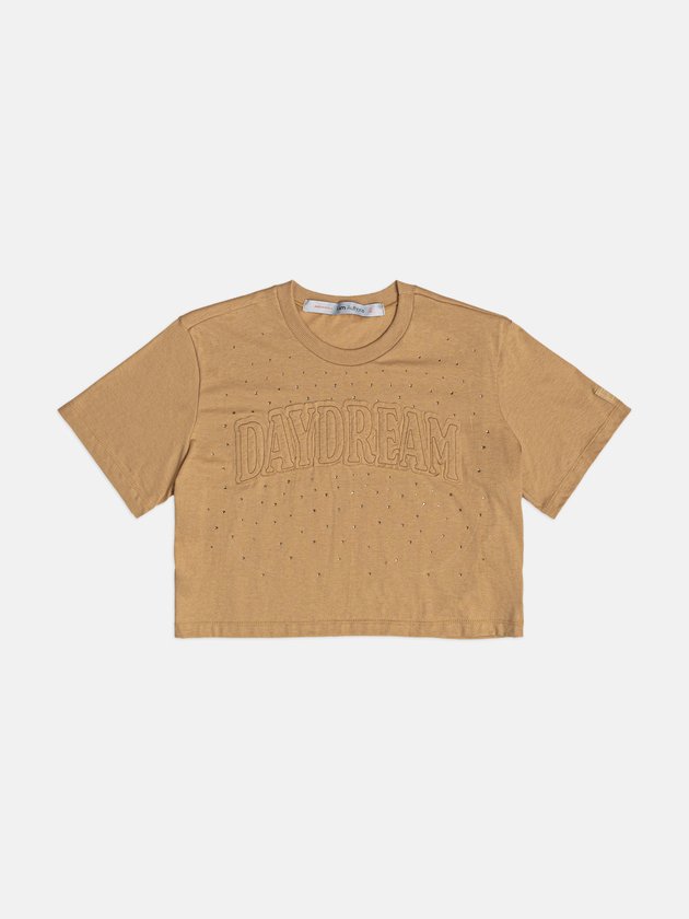 A t-shirt cropped caramelo DAYDREAM mistura básico e fashion em uma peça super versátil. Feita em malha confortável, ela traz o lettering em alto-relevo no centro com mini aplicações brilhosas espalhadas pela frente, criando um visual moderno e iluminado. A modelagem cropped soltinha deixa o look descolado, enquanto a gola canelada mantém o caimento estruturado. O tom caramelo é neutro e estiloso, perfeito para compor produções urbanas, casuais e até mais arrumadinhas. Ref.: R5601