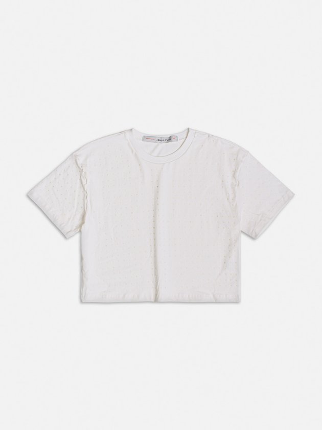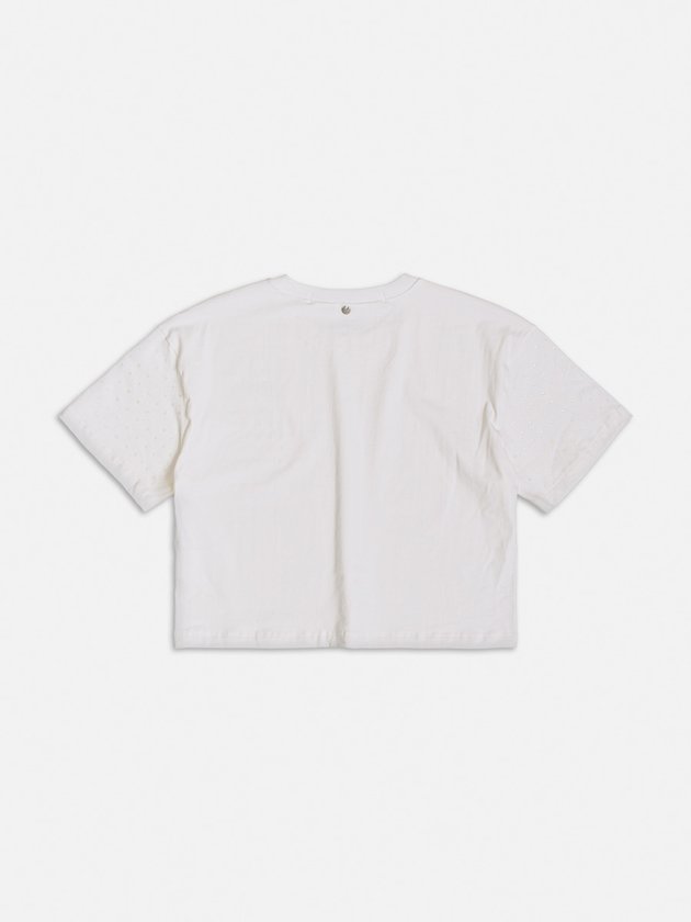 Elegante e charmosa, esta T-shirt off white com strass é ideal para um visual casual com um toque glamouroso. O brilho dos strass adiciona sofisticação, perfeita para looks versáteis.