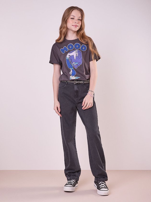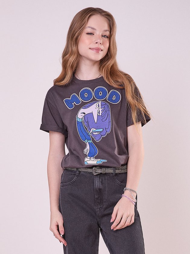 A T-shirt Tédio na cor chumbo é perfeita para as meninas que adoram moda com um toque de humor. Feita em meia malha, esta t-shirt possui decote com friso em ribana, trazendo conforto e durabilidade. A frente destaca a estampa do personagem Tédio do filme Divertida Mente 2 com aplicação de strass, adicionando brilho e sofisticação. Abertura da manga e barra com bainha e uma plaquinha de metal no centro do decote costas finalizam o design único. Ref.: R5033