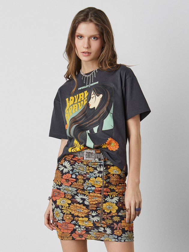 A T-shirt foi feita em parceira com a Disney + Authoria e confeccionada no conforto da meia malha na cor preta. Traz estampa exclusiva da personagem Mulan na parte da frente e etiqueta decorativa costurada na barra. Composição: 100% algodão. Ref.: T8631