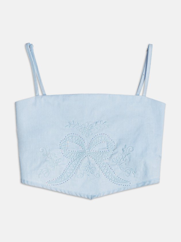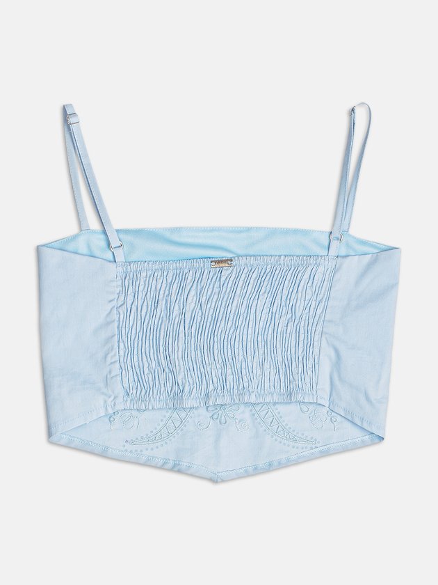 O tricoline estruturado encontra o brilho delicado do strass e o toque artesanal do bordado nesse top azul impactante. Um item fashionista, com apelo elegante e fresh ideal para produções com brilho leve e sofisticado.