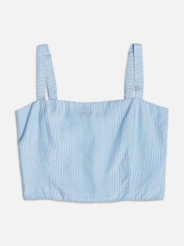 As listras em azul claro traduzem frescor e atemporalidade. Em modelagem clean e versátil, esse top é perfeito para composições navy ou com estética preppy.