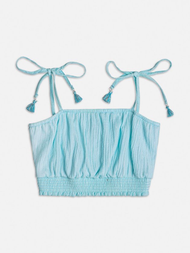 O cropped verde acqua I Am é feito em tecido com fios de lurex, proporcionando um brilho sutil e elegante. Com alças de amarrar, a peça permite ajuste personalizado e o elástico na barra confere um caimento perfeito. Um item diferenciado e fashion, ideal para compor looks cheios de personalidade. Composição: 99% algodão e 1% poliéster. Ref.: R3895