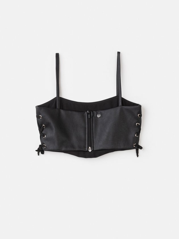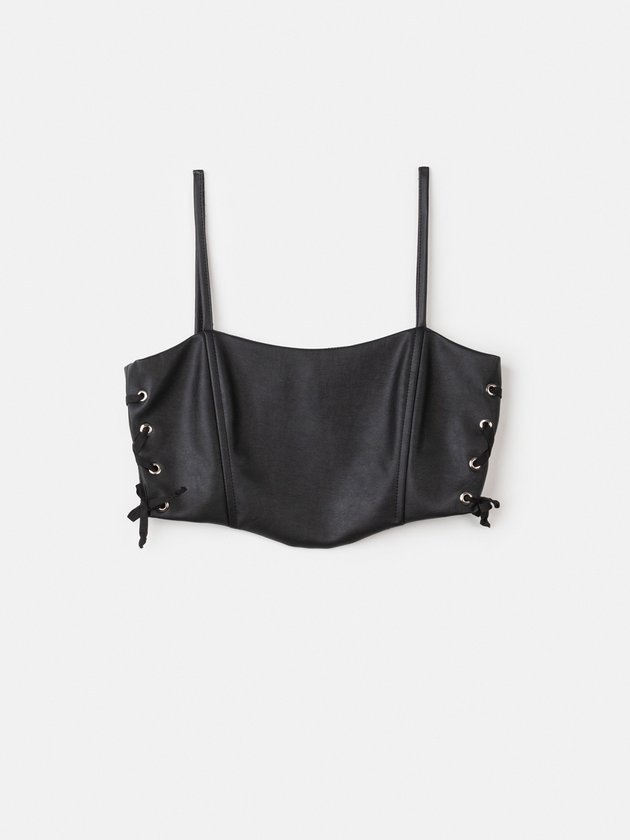 Trazendo uma tendência super em alta, o cropped corset Authoria foi elaborado em fake leather. Para deixar o seu visual ainda mais fashion conta com amarração na lateral e nas costas traz zíper e plaquinha de metal da marca. Composição: 100% viscose e revestido em 100% poliuretano. Ref.: T8795