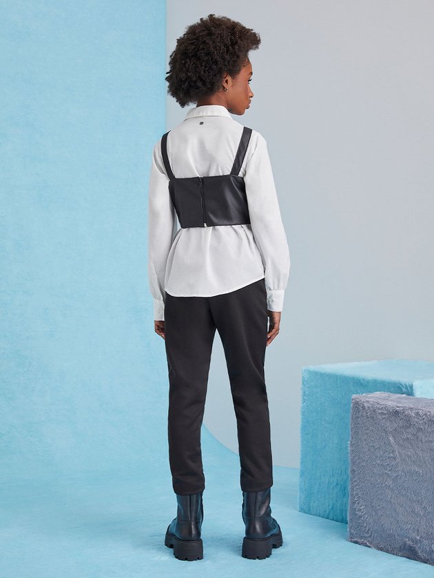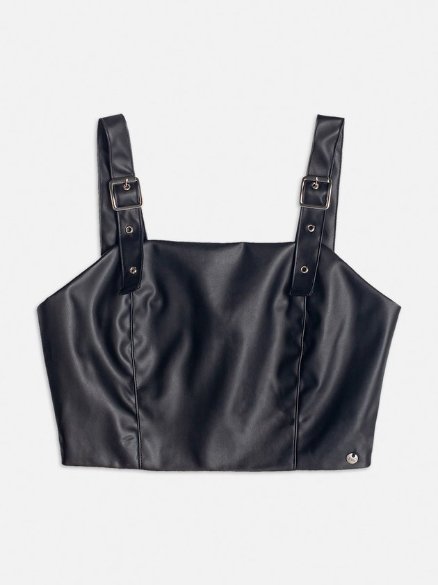 O cropped preto I Am é desenvolvido em fake leather, além de versátil é uma peça que deixa as garotas ainda mais estilosas. Conta com recorte e alças com regulador. Seu fechamento conta com zíper em metal para deixar a peça mais ajustada e confortável no corpo. Composição: Cropped: 100% poliéster. Revestimento: 100% poliuretano. Ref.: R4179