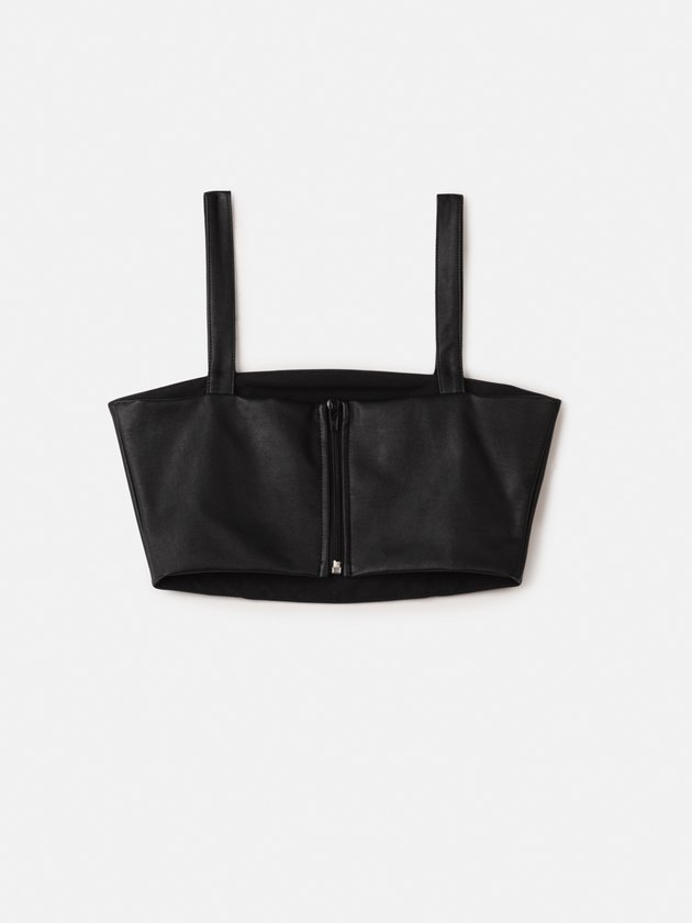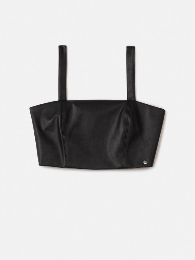O cropped preto I Am é confeccionado em fake leather, com abertura nas costas por zíper e uma plaquinha de metal na frente. Sua estética moderna e versátil segue as últimas tendências da moda. Composição:100% poliuretano. Ref.: R3749