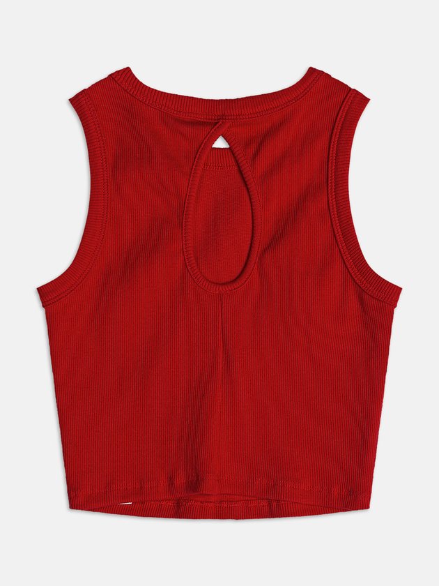 Com tonalidade intensa, o top vermelho de ribana atualiza o básico com energia. Uma peça perfeita para looks vibrantes com mood jovem e ousado.