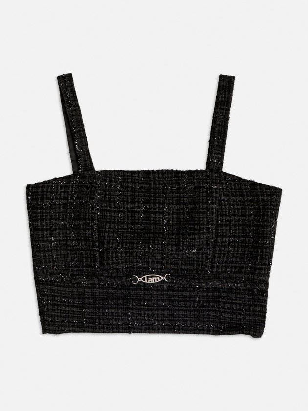 O tweed entra em cena com elegância total nesse cropped estruturado com alças e acabamento sofisticado. O charme final fica por conta do logo metálico da I Am na parte frontal.